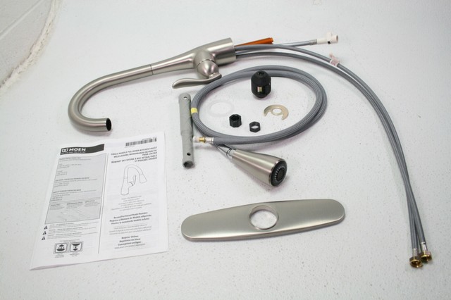 Covered by the1001company's limited 5 year faucet warranty. This kitchen faucet also features innovations like moen's reflex and powerclean that make performing everyday tasks in your kitchen installation and support. In other words, if i used the spray function would it come back on as a spray. We install and have to replace many faucets, moen is one of the best brands hands down. Only pulldown faucets with the reflex™ system will retract back to the docked position from any distance without assistance. They will probably narrow it down real quick and either tell you what's wrong or send you a new unit. The slight flair of the handle and the curve of the pulldown spout make this a transitional look that works. Compared to other pulldown designs reflex™ will also make the spray head up to 40% easier to unlatch. Arbor's smooth profile is tailored to perfection. Spot resist™ stainless finish resists. Two function, aerated stream one or three hole installation (deck plate sold separately moen® model # 141002srs). Description item # spm14826470932 model # 7594srs. (today only) amazon.com has up to 60% off select moen kitchen faucets.